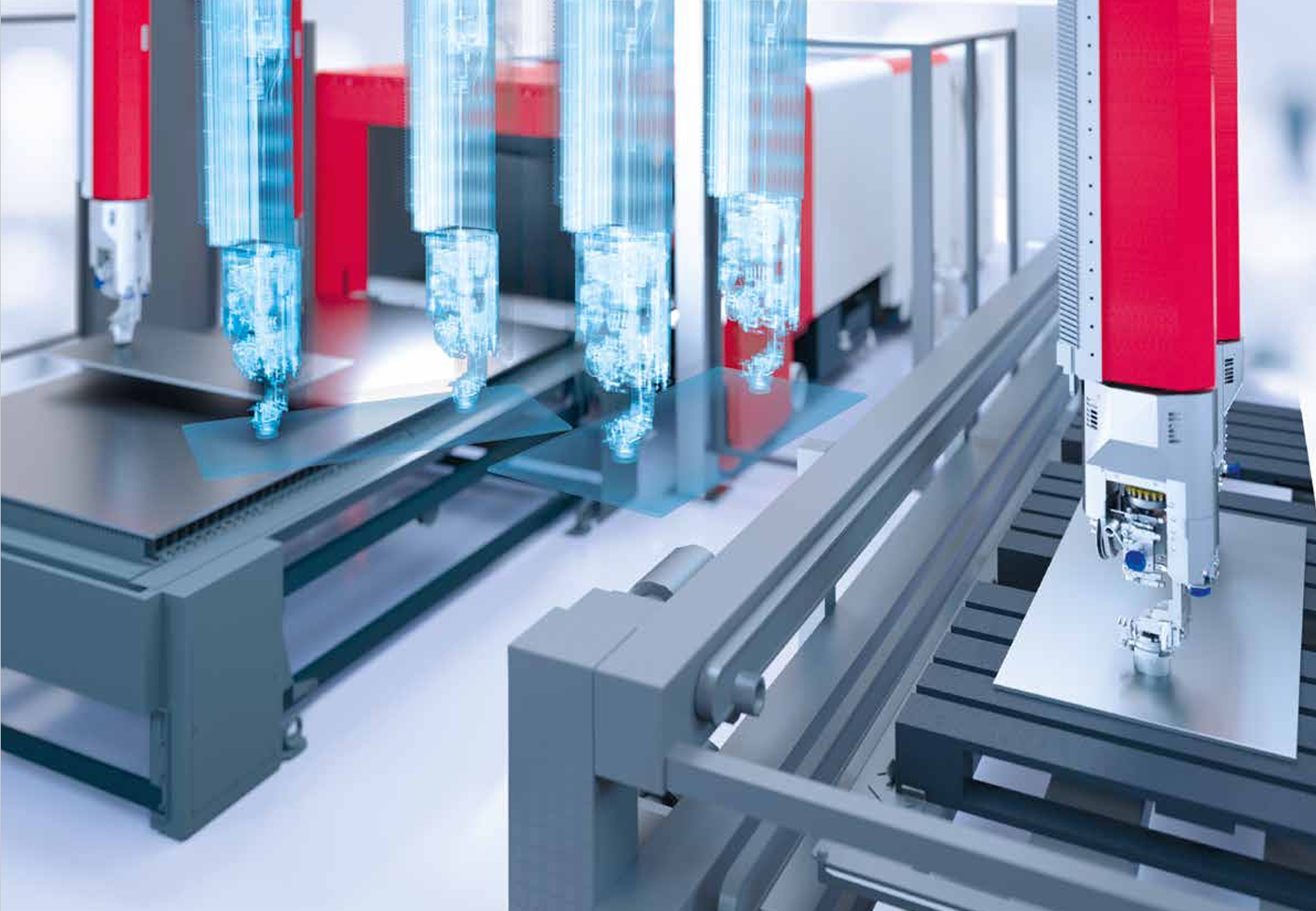 Lo SkyWay è costituito da due manipolatori separati, uno per il carico e uno per lo scarico. In questo modo possono essere eseguite diverse operazioni contemporaneamente, riducendo il tempo di ciclo al minimo assoluto di 58 secondi (3015). Il dispositivo a spazzole rimuove automaticamente i residui lasciati sul pallet del sistema laser per garantire un processo di automazione stabile.